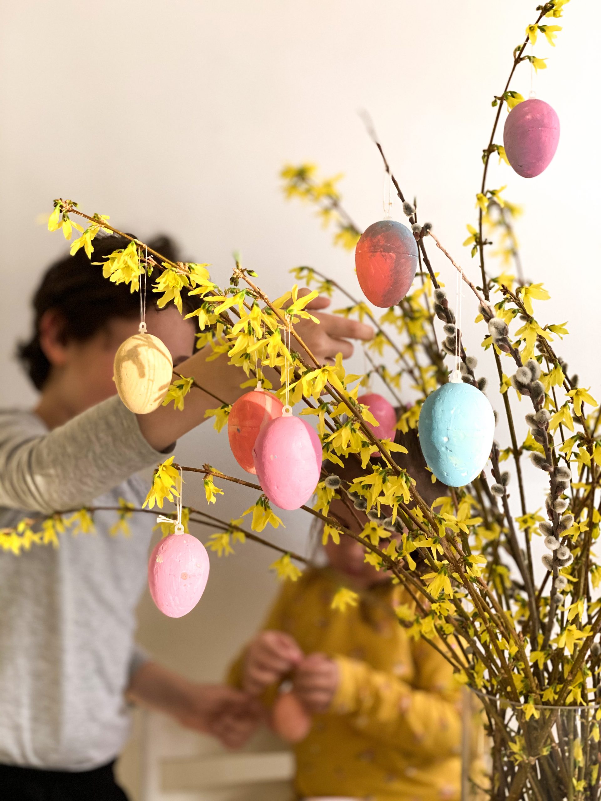 V velikonočnem času otroka neizmerno uživata v barvanju stiroporastih jajčk, ki jih potem obesita na pomladne veje in tako naša velikonočna miza zažari v vsej svoji praznični podobi.